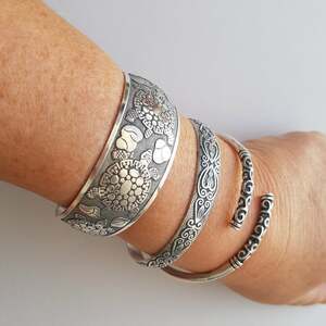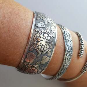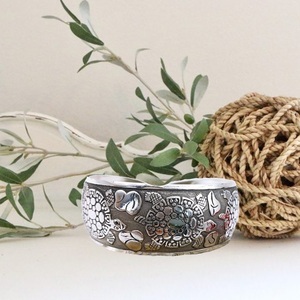 Широкий браслет тибетской, индийской тематики с чеканным орнаментом в виде плывущих черепах символизирующих богатство, мудрость, долголетие и защиту.
