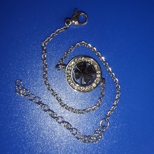 Браслет на тонкой цепочке якорного плетения с изящным круглым медальон, внутри которого помещен четырехлистный клевер.