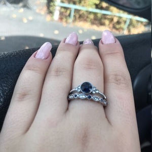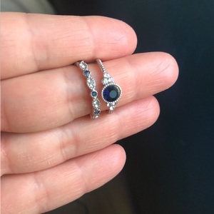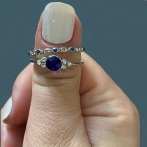 Другое кольцо в центре венчает крупный минерал королевского синего цвета, с двух сторон его дополняют по три прозрачных фианита меньшего размера.