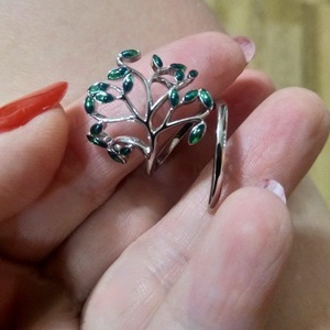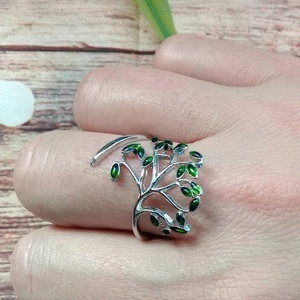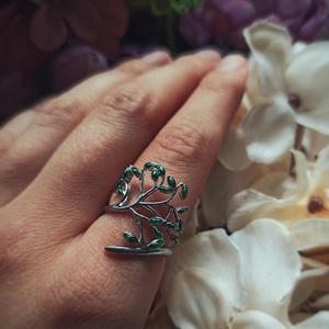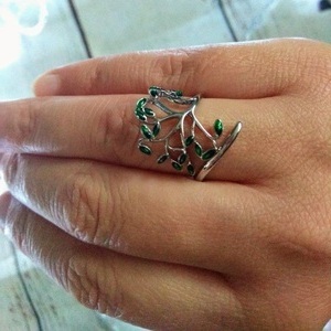 Украшение ручной работы, поэтому размах ветки у каждого кольца может немного отличаться друг от друга, цвет нанесенной эмали так же уникален и варьируется от нежно-салатового до насыщено-зеленого.