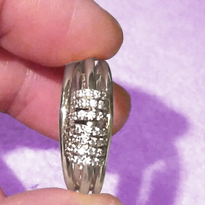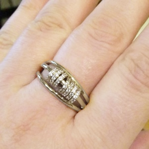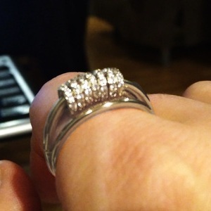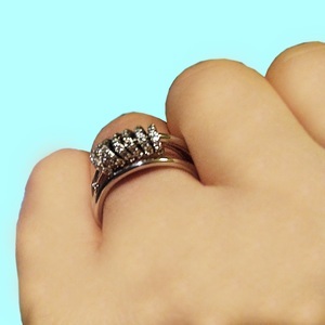 Кольцо в виде трех тонких обручей плавно переходящих в литую шинку с открытой внутренней частью, которая удобно регулируется под нужный размер. Центральный обруч имеет свободно двигающиеся плоские бусины с сияющими кристаллами минерала циркон.