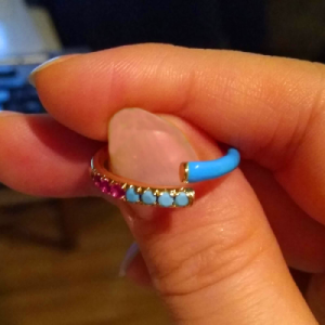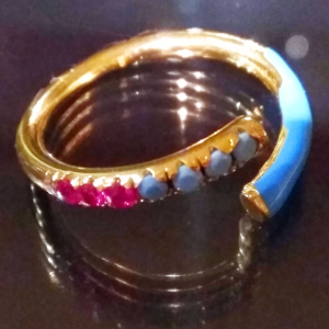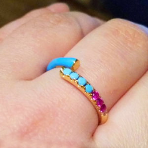 Кольцо с литой шинкой плавно переходящей в две вставки, с одной стороны в голубую непрозрачную глянцевую эмаль, с другой в дорожку переливающихся цветных австрийских кристаллов. Кольцо безразмерное, удобно регулируется под нужный размер.