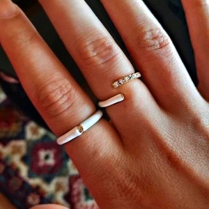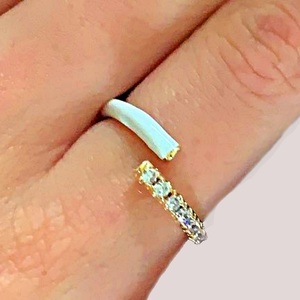 Кольцо с литой шинкой плавно переходящей в две вставки, с одной стороны в белую непрозрачную глянцевую эмаль, с другой в дорожку переливающихся австрийских кристаллов. Кольцо безразмерное, удобно регулируется под нужный размер.