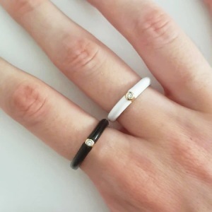 Кольцо с переливающимся кристаллом в центре, с двух сторон расположены вставки чёрной непрозрачной глянцевой эмали плавно переходящие в литую шинку с открытой внутренней частью, которая удобно регулируется под нужный размер.