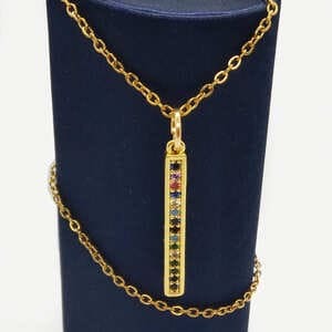 Изящная цепочка якорного плетения с золочёной подвеской, брусок с дорожкой цветных камушков из австрийских кристаллов. Каждый кулон индивидуален, кристаллы идут не по цветовому ранжиру, но это только добавляет украшению эксклюзивности.