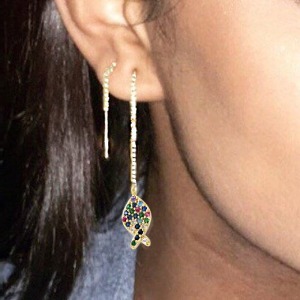 Серьги-протяжки с нежными цепочками (кубические змейки) и золотыми подвесками в виде рыбок c цветными прозрачными камушками. Вставка из австрийских кристаллов может включать цвета - синий, рубиновый, изумрудный, белый, черный, бирюзовый, розовый, фиолетовый, сиреневый.