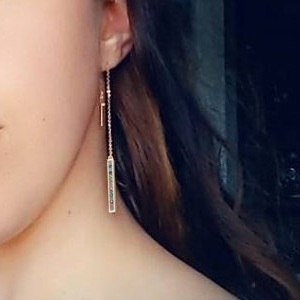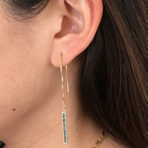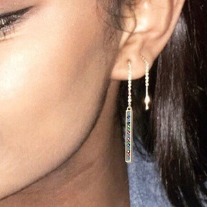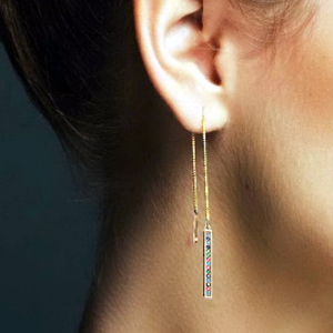 Серьги-протяжки с нежными цепочками (кубические змейки) и золотыми подвесками в виде брусков, на одной из сторон расположены чередующиеся цветные прозрачные камушки. Вставка из австрийских кристаллов может включать цвета - синий, рубиновый, изумрудный, белый, черный, бирюзовый, розовый, фиолетовый, сиреневый.