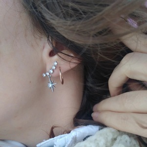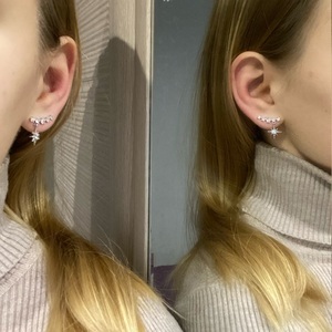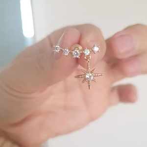 Основной элемент пусет изящные подвески в виде восьмиконечной вифлеемской звезды размером 1x1 см. В центре звёзд расположены прозрачные фианиты.