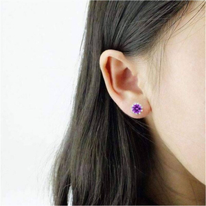 Серьги-гвоздики выполнены в форме миниатюрных серебряных корон в центре пусет кристаллы алмазной огранки, блестящие фиолетовые камни минерала циркон.