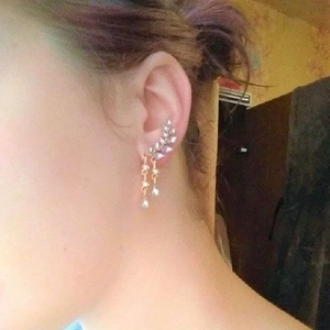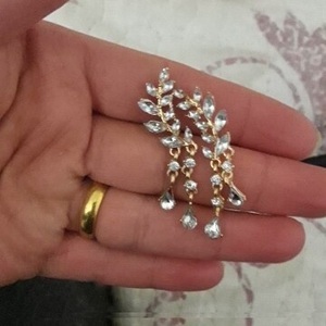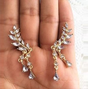 Серьги-пусеты золочёные с кристаллами Dew Drops Earrings Gold - украшение для торжественных мероприятий и светских вечеринок, серьги в форме веточек оливы с листочками размером 2x1,8 см., в нижней части пусет две асимметричные подвески в виде капель росы размером 2,5 см. и 1,8 см.